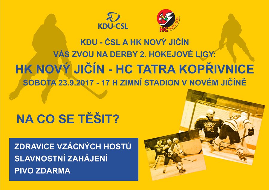 Příjďte společně s námi podpořit svůj tým. Derby mezi kluby HK Nový Jičín a HC Tatra Kopřivnice je vždy zárukou kvalitního hokeje. Akci svou účastí a slavnostním vhozením úvodního buli podpoří lídr naši kandidátky do poslanecké sněmovny Mgr. Pavla Golasowská.